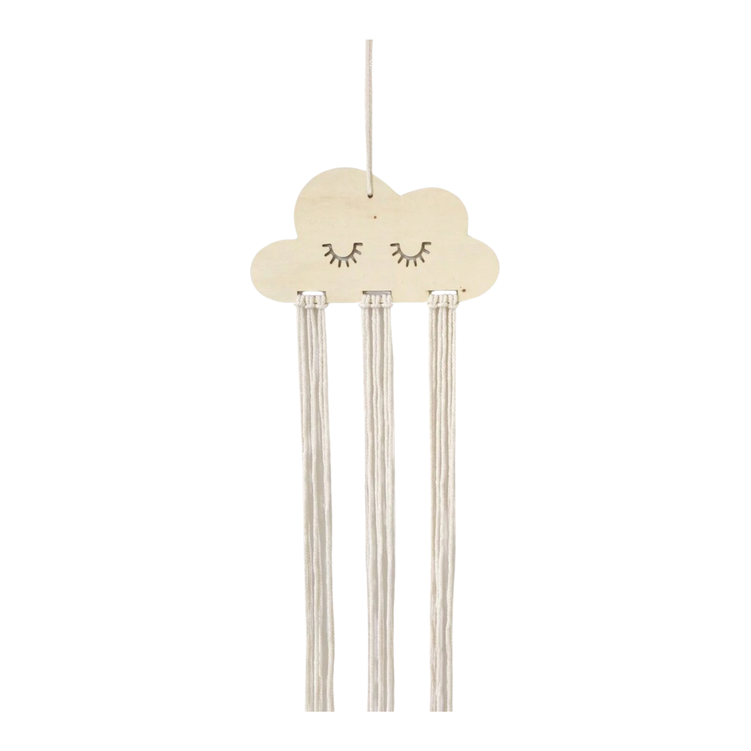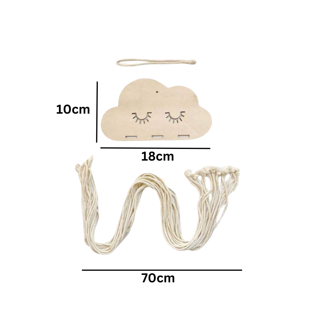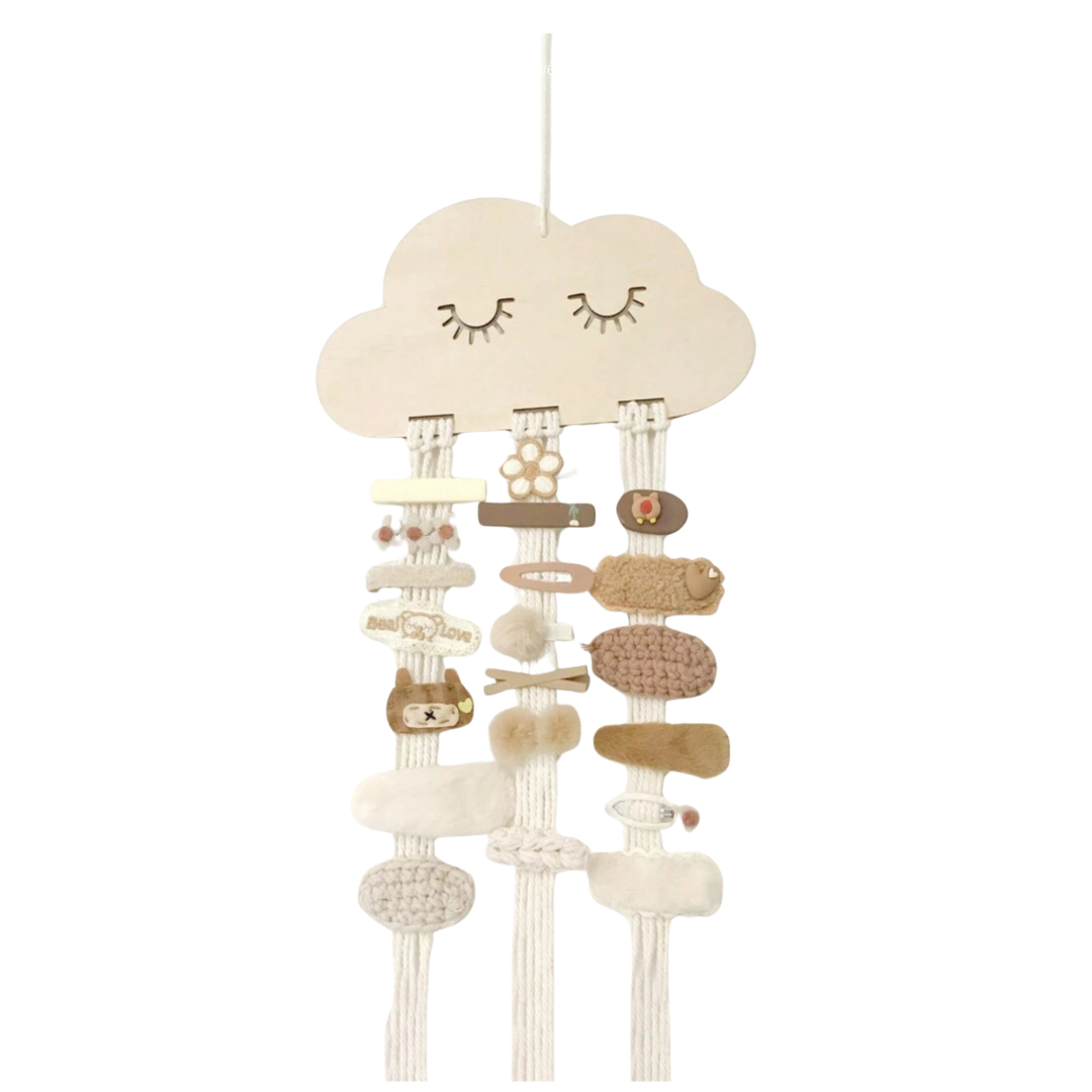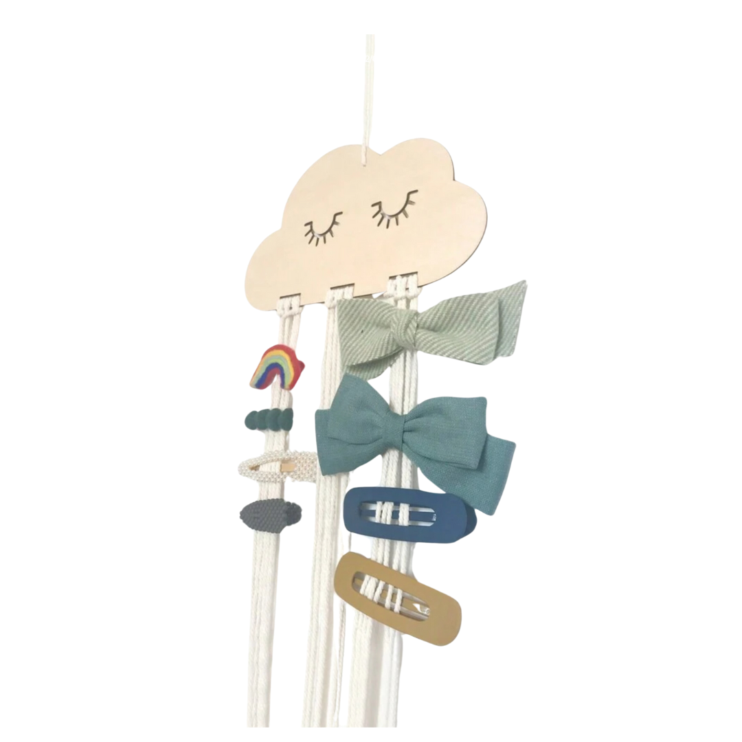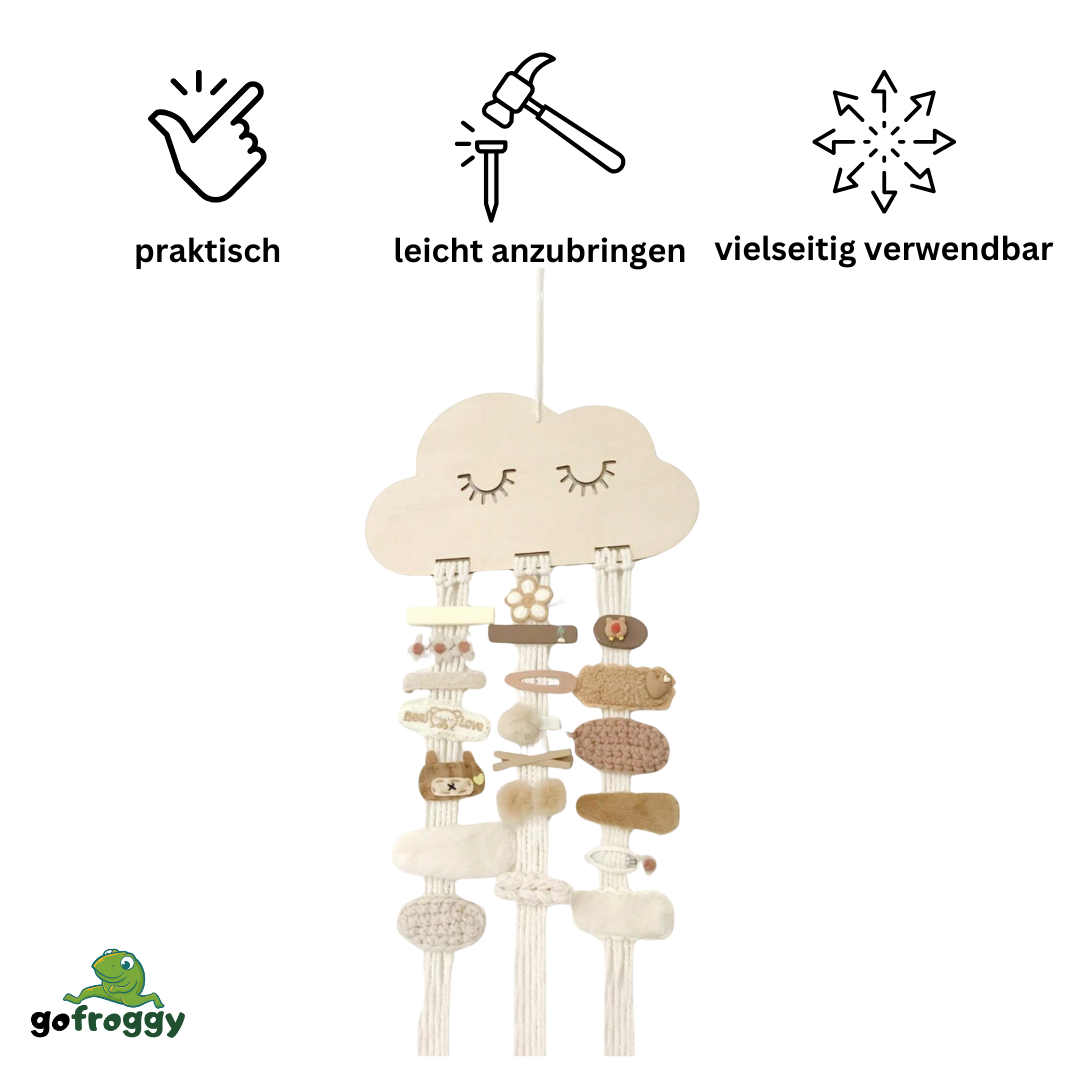 Diese hängende Aufbewahrungslösung im niedlichen Wolkendesign bringt eine verspielte und dekorative Note in jedes Kinderzimmer. Sie ist ideal, um Haarspangen, Haargummis und kleine Accessoires geordnet und sichtbar aufzubewahren – kein langes Suchen mehr.
